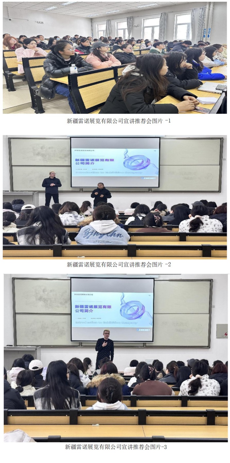 本次推荐会公司宣讲人与学生在现场面对面交流,从公司介绍、服务内容、案例说明三个方面为学生介绍。会议伊始,负责人对其公司进行简单介绍,他表明新疆雷诺展览有限公司以促进“一带一路”经济发展为己任,秉承为客户提供专业化、品牌化、国际化的展会服务理念。其次,负责人介绍新疆雷诺展览有限公司新媒体部主要从代运营、推广及策划;本地生活服务;电商等三个板块进行工作,讲述其公司运用大数据分析、人工智能推荐等先进技术,为用户提供个性化的服务推荐。最后,负责人通过举案例的方式与现场学生互动,活跃会场气氛,并且希望商学学子能够积极投递简历,实现短期目标。