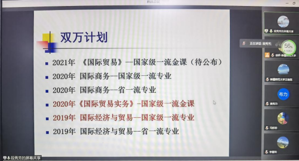 3月5日,应我院邀请,新疆财经大学国际经贸学院原院长段秀芳教授莅临指导,为我院教师开展“如何申报和建设国家级一流本科专业”的线上主题讲座,讲座由学院党委书记王维然教授主持。