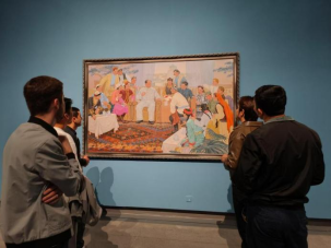 研学活动中,留学生参观了“丝路印记”“当代新疆”等主题展厅驻足于《民族大团结》等代表性作品前,认真欣赏,热烈讨论,对中国艺术的多元性与包容性表现出浓厚兴趣,不少留学生在观展过程兴致勃勃地自己喜爱的作品合影。