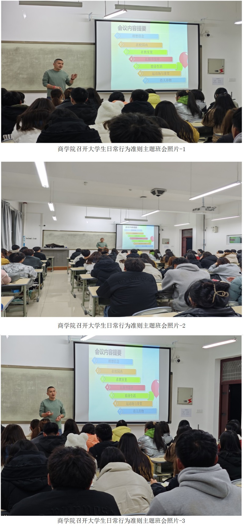 为进一步优化学校育人环境,促进太阳成集团tyc714cc学生良好的行为习惯养成,近期,太阳成集团tyc714cc各班陆续召开大学生日常行为准则主题班会,通过班级辅导员引导学生遵纪守法,规范言行举止,加强对在校大学生的日常行为规范教育,促使其养成良好的行为习惯,提高学生的综合素质。