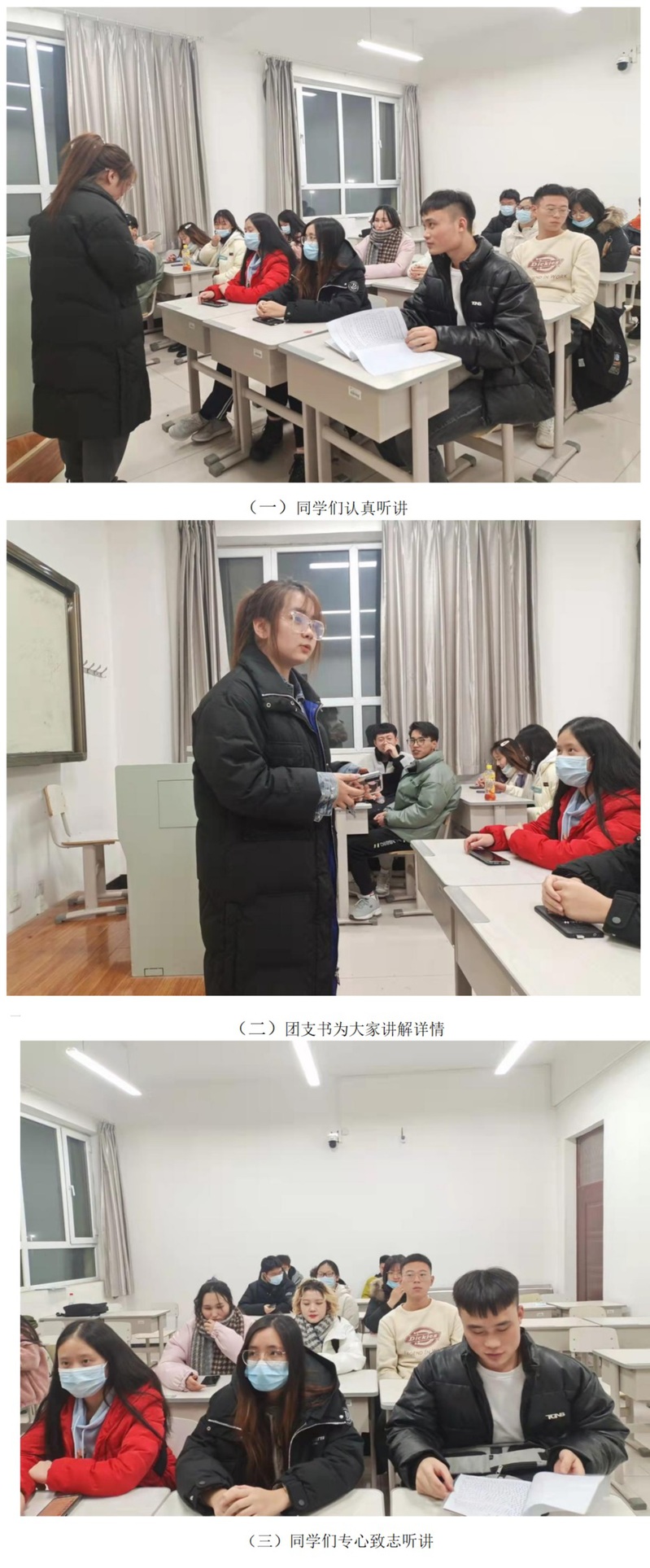 团支书带领同学们分别进行了党的十九届六中全会主要文件精神、习近平总书记在庆祝中国共产党成立100周年大会上的重要讲话、习近平总书记在纪念五四运动100周年大会上的重要讲话等党重要会议的精神传递,并进行了《团章》第一章及《中国共产主义青年团团员教育管理工作条例》(试行)的学习,班长深情的对同学们说:“正如以爱国主义为核心的五四精神所传递的青年人自强不息,为国为民的伟大精神,我们新一代的青年也应奋发向上,遵守党团纪律,努力提升自我,团结奋斗,自强不息,争取为中华民族伟大复兴的事业奋斗终生。”