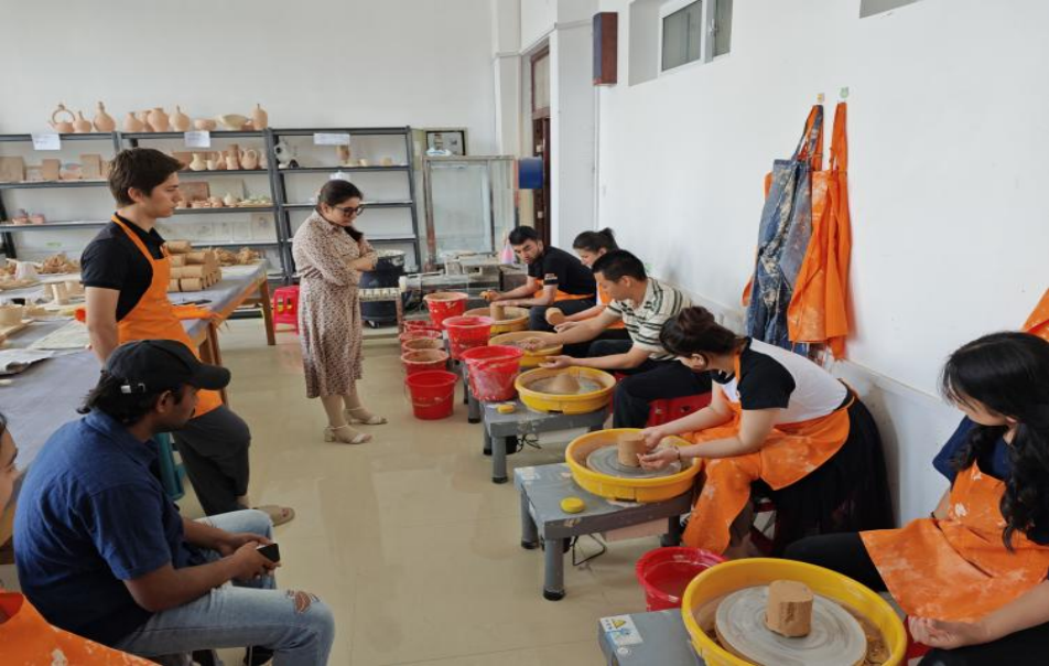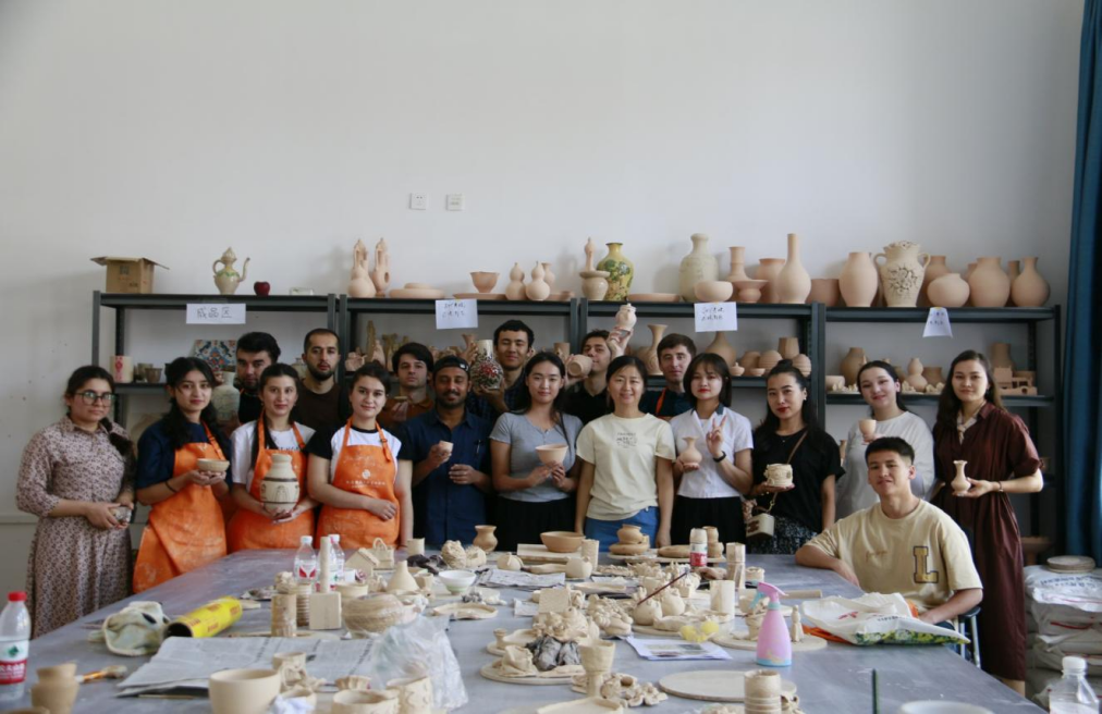 2024年6月11日上午,我院组织来自哈萨克斯坦、吉尔吉斯斯坦,塔吉克斯坦等国家的20多名留学生前往太阳成集团tyc714cc铸牢(美育)教育实践基地进行陶艺DIY体验活动。