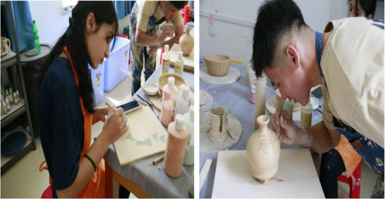一到达现场,留学生们就被一个个陶艺制作工作台和形彩各异的陶瓷艺术品所吸引。在聚精会神听完陶艺老师关于中国陶瓷历史发展和文化精髓的精彩讲解,以及学习陶艺制作过程演示后,大家跃跃欲试纷纷上台亲自动手制作起来。