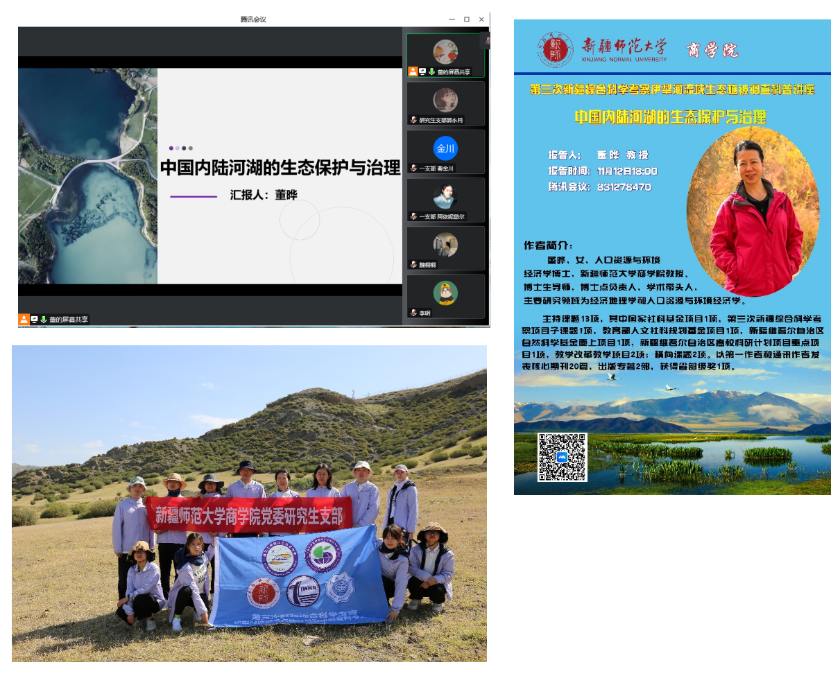 2022年11月12日下午,由太阳成集团tyc714cc研究生支部牵头,组织与本科生第一、第二支部展开联谊活动,研究生支部书记董晔同志做第三次新疆综合科学考察伊犁河流域生态植被调查的线上科普讲座,主题是《中国内陆河湖的生态保护与治理》,会议由研究生支部宣传委员郭永肖主持。